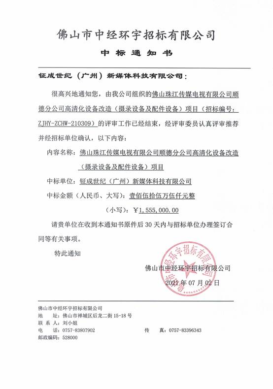 喜訊|钲成世紀中标佛山(shān)珠江傳媒電(diàn)視↓π<(shì)有(yǒu)限公司順德分(fēn)公司高(gāo)清₽δ÷化(huà)設備改造項目