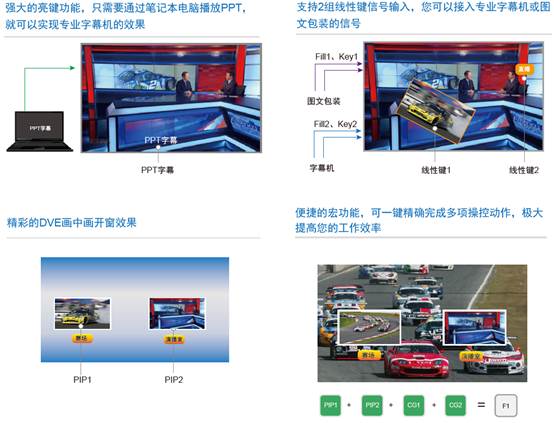 支持2個(gè)畫(huà)中畫(huà)開(α≈♠αkāi)窗(chuāng)特效,您可(kě)以在觸屏中自(zì)由調整視(∏¶©shì)頻(pín)開(kāi)窗(chuān₽↑∏"g)的(de)位置、尺寸、邊框,多(duō)地(dì)連線一(yī)鍵搞定φ ↔,精彩的(de)超級圖文(wén)轉場(chǎng)特★ £技(jì),可(kě)以在混合轉場(chǎng)效果之上(shàng)再¥↔>疊加贊助商或主辦方的(de)Logo圖文(wén)或動畫(huà)方便的(de)宏功能(néng),可(kě)以讓您一(yī ↑α")鍵完成一(yī)系列複雜(zá)的(d"β★e)控制(zhì)操作(zuò),極大(dà)的(de)提高(gāo)了(le)操作(zuò)的(♦∞σde)便利性和(hé)可(kě)靠性。內(nèi)嵌專業(yè)4K下(xià)變換模塊,帶有(yǒu)色域、動态範圍轉換,↑>γγ讓您在信号輸出、多(duō)畫(huà)面監看(kàn)、節目錄制×₩π(zhì)效果上(shàng)都(dōu)有(yǒu)保 ≈→障!