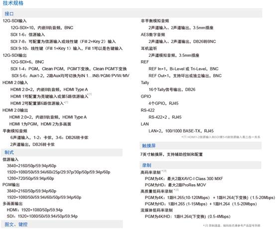 配備6個(gè)圖文(wén)內(nèi)鍵,不(bù)僅支持靜(jìng)态圖文φ'(wén)還(hái)支持動畫(huà),您可(kě)以充分(f÷✔ēn)發揮創意,呈現(xiàn)各種圖文(wén)效果支持2組外(wài)部鍵信号輸入,您可(kě)以在αφ•不(bù)損失輸入通(tōng)道(dà∏¥✘✔o)數(shù)量的(de)情況下(xià),額外(wài)接入專業(yè)字幕機(jī)或圖文•★(wén)包裝系統的(de)信号強大(dà)的(de)亮(liàng)鍵功能(néng),隻需通(tō ©ε↑ng)過筆(bǐ)記本電(diàn)腦(nǎo)播放(γ∏fàng)PPT或字幕軟件(jiàn),就(jiù)可(kě)以實現(xiàn)專₽©©業(yè)字幕機(jī)的(de)效果專業(yè)的(de)色鍵摳像技(jì)術(shù),讓您輕松完成逼真的(de¥¥£)虛拟場(chǎng)景、支持任意制(zhì)式的(de)信号輸入,•÷>多(duō)達8個(gè)4K/HD訊道(dào)淨切換,可(kě)同時(shí)輸出4K和(hé)HD版PGM,極大(dà)提高(gāo)了(le)4K節目制(zhì)作(zuò)的(de)便利性、內(nèi)置2通(tōng)道(dào)DDR視(shì)音(yīn)頻(pín)播放(f≤ àng)器(qì),支持長(cháng)文(wé"±∑σn)件(jiàn)播放(fàng),可(kě)通(t•βαōng)過觸屏一(yī)鍵選擇來(lái)源,文(wén)件(jiàn)可(kě)存放(f♥∞≥$àng)在內(nèi)置存儲或熱(rè)✘÷插拔SSD中、內(nèi)置2通(tōng)道(dào)音(yīn)頻(pín)播放(fàng)器(>≤qì),在現(xiàn)場(chǎng)活動中輕松混入背景音(yī♦∑n)樂(yuè)、支持多(duō)通(tōng)道(dào)錄制(zhì)γ'和(hé)實時(shí)流發布,內(nèi)置高(gāo)質量編碼單元∏,支持XAVC/ProRes+H.265+H.264格式,可(kě)同時(shí)錄制(zhì)4路(lù)高(gāo)質量文(wén)件(jiàn),錄制(zhì)文(wén)件(jiàn)兼容多≠✘€≈(duō)種後期軟件(jiàn)、支持将節目錄制(zhì)到(dào)熱(rè)插拔SSD中,存儲介質易購(gòu)便攜,素材交換靈活方便推流內(nèi)容可(kě)以同時(shí)發布到(dào)多(duō)個(™±•&gè)視(shì)頻(pín)直播平台,還(hái)可(kě)以“點對(duì)點”回傳到(dào)台內(nèi)演播室。