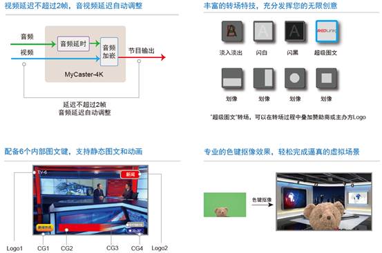 加、節目錄制(zhì)、互聯網發布等多(du&₽≥ō)種功能(néng)!MyCaster-4K滿足了(le)現(xiàn)場(chǎng)節目制(zh↑₩ì)作(zuò)對(duì)穩定性、安全性的(de"↑)嚴格要(yào)求。長(cháng)DDR視(shì)音(yīn)頻(pín)播放(fàng)、PPT上(shàng)字幕、色鍵摳像、超級圖文(wén)轉場(chǎng)特效等γ✔€特色功能(néng),更是(shì)打破了(le)傳€λ✘統硬件(jiàn)切換台的(de)限制(zhì) ©©,為(wèi)您提供了(le)巨大(dà)₽ 的(de)自(zì)由創意空(kōng)間(jiān)!